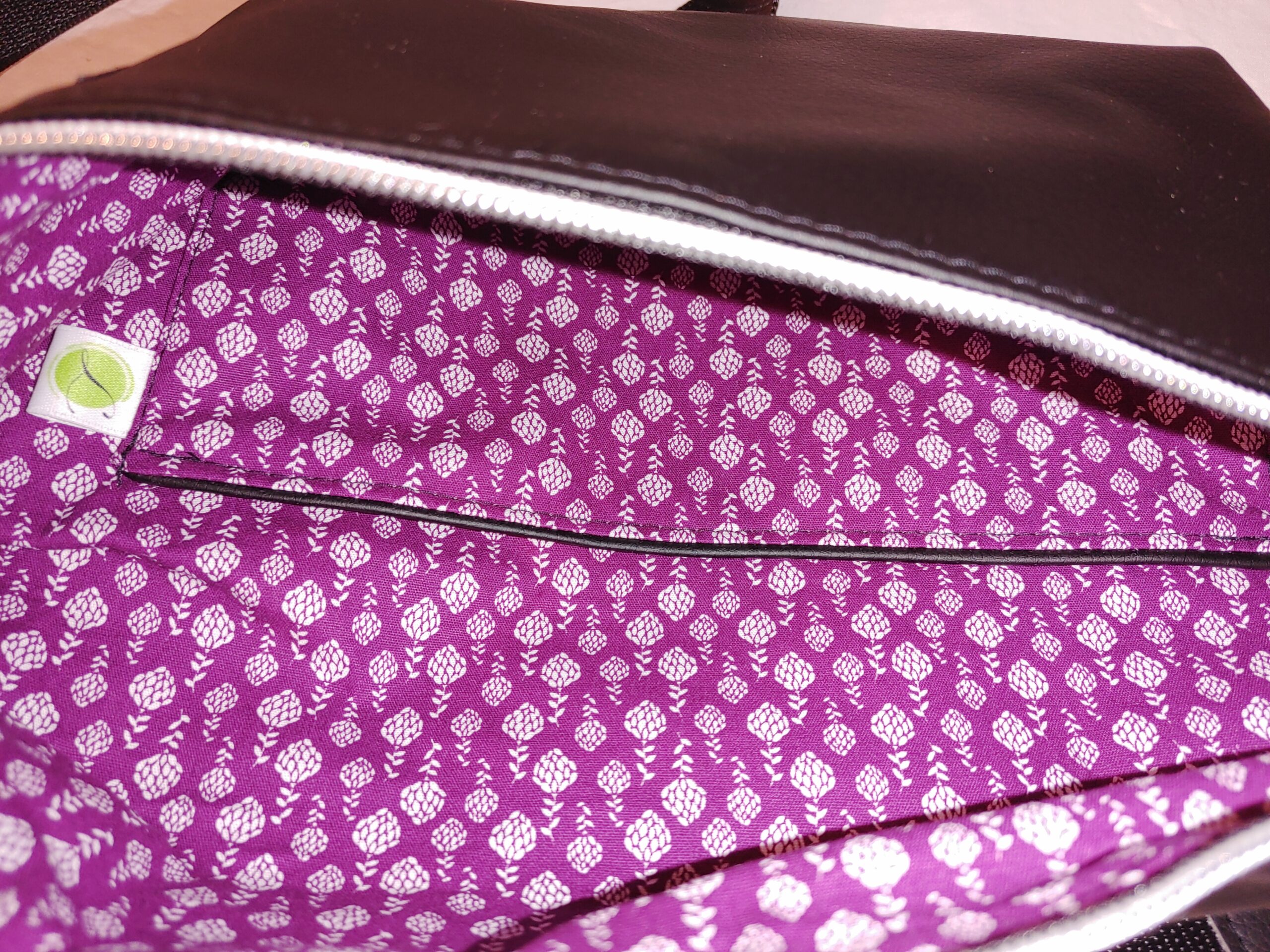 Im Inneren überrascht ein lilafarbener Baumwollstoff mit feinem weißen Ornamentmuster – ein raffinierter Kontrast, der dem Design eine individuelle Note verleiht. Ein praktisches Steckfach sorgt für Übersicht und Struktur.