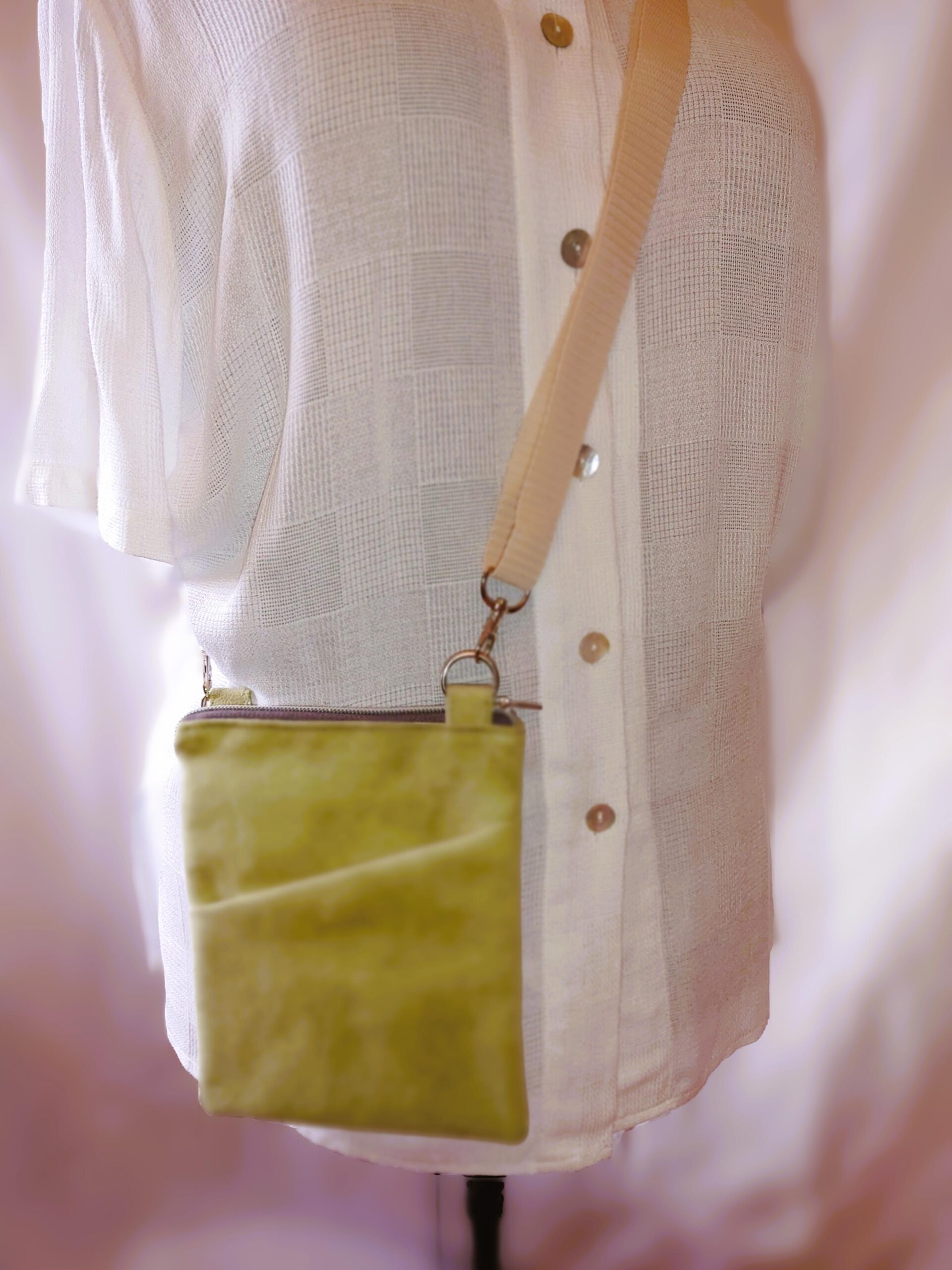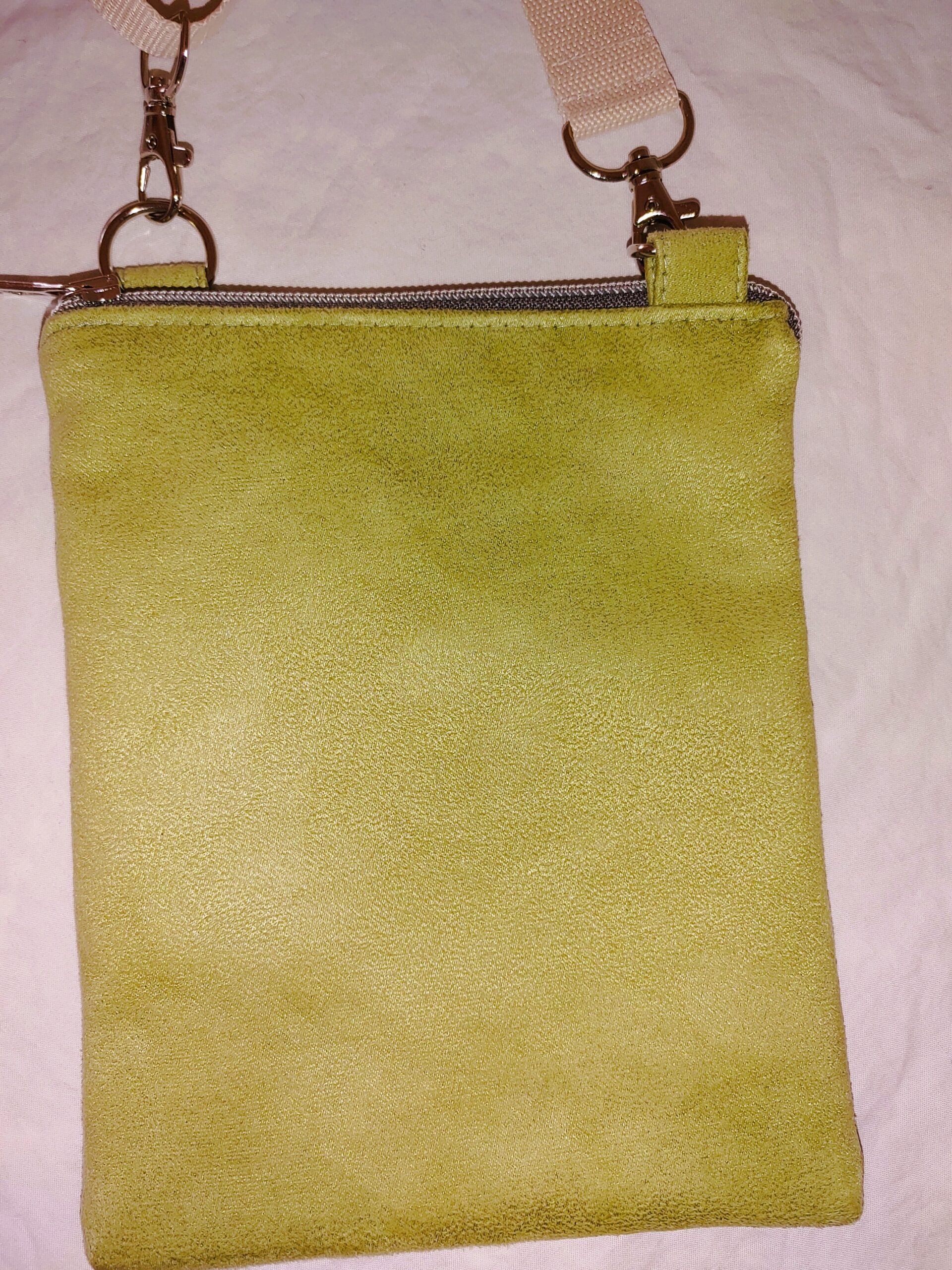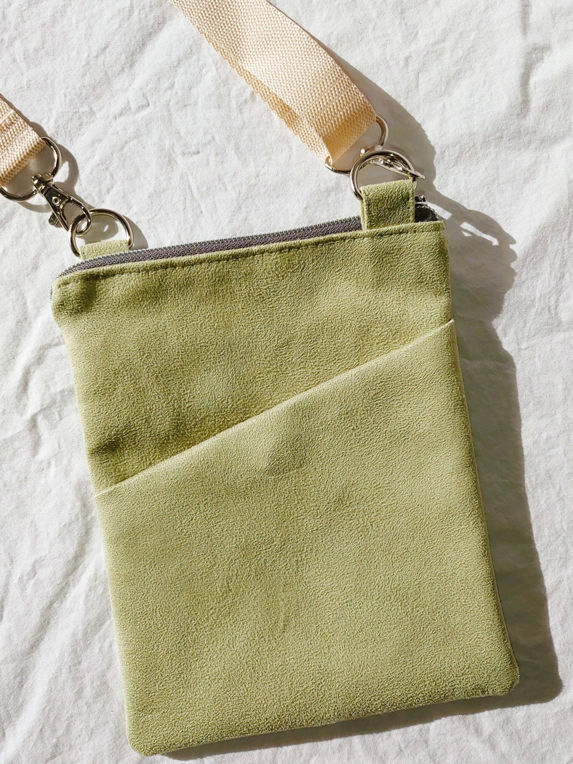 Frisches Hellgrün trifft auf liebevolle Handarbeit: Kleine handgenähte Umhängetasche aus angerautem Kunstleder mit Steckfach und verstellbarem Gurt – dein stylischer Begleiter für Alltag, Reisen oder Freizeit.