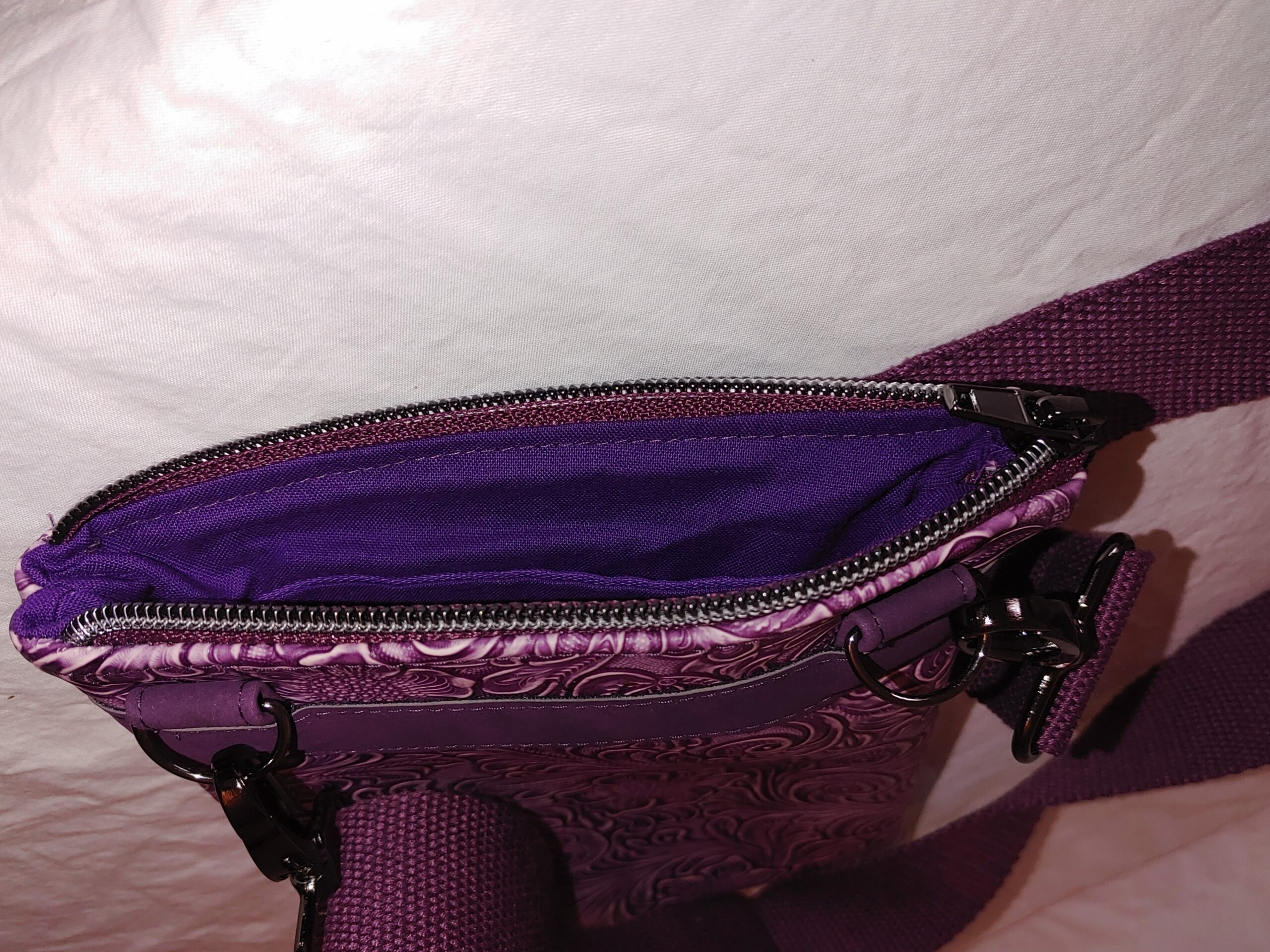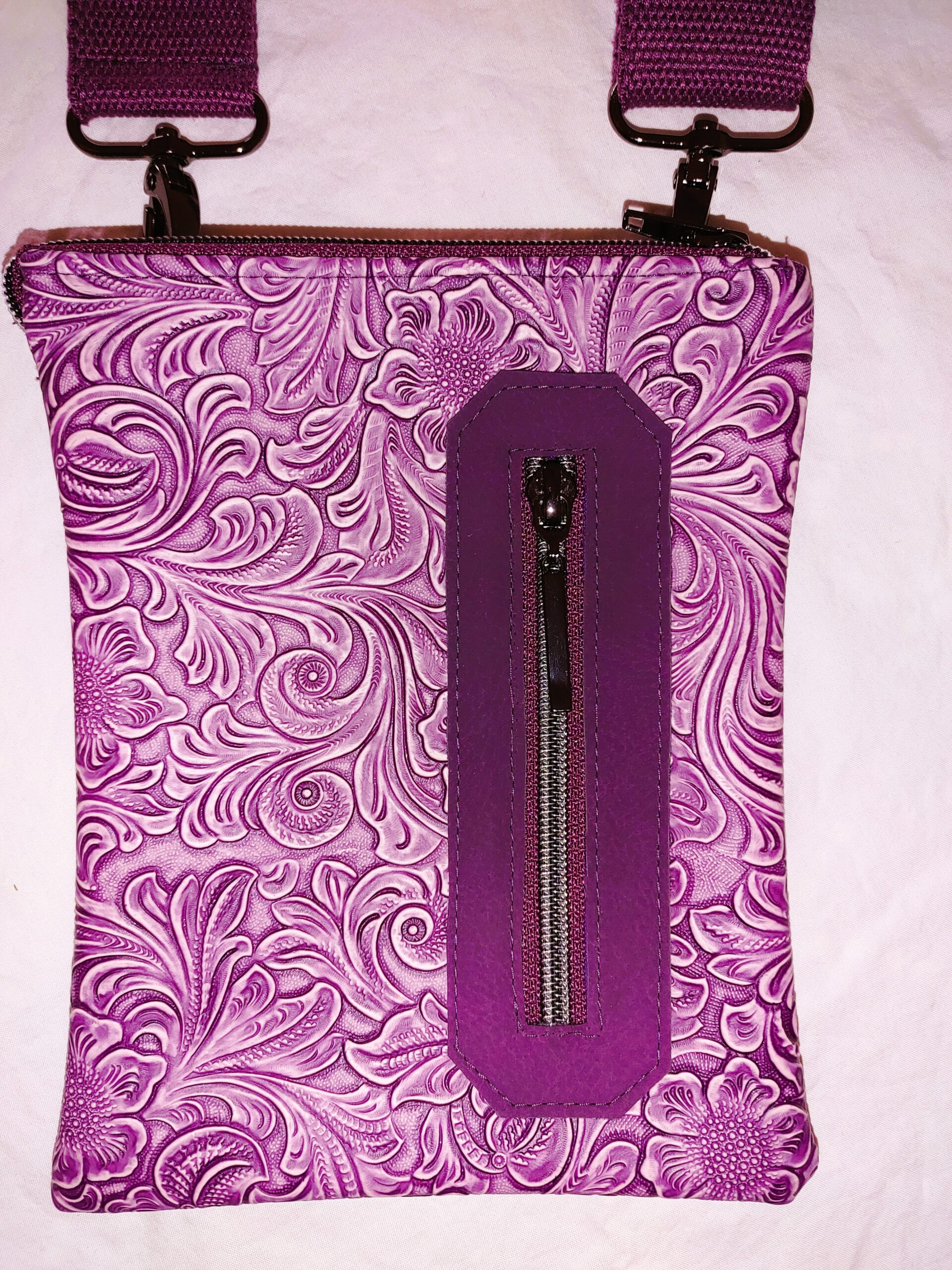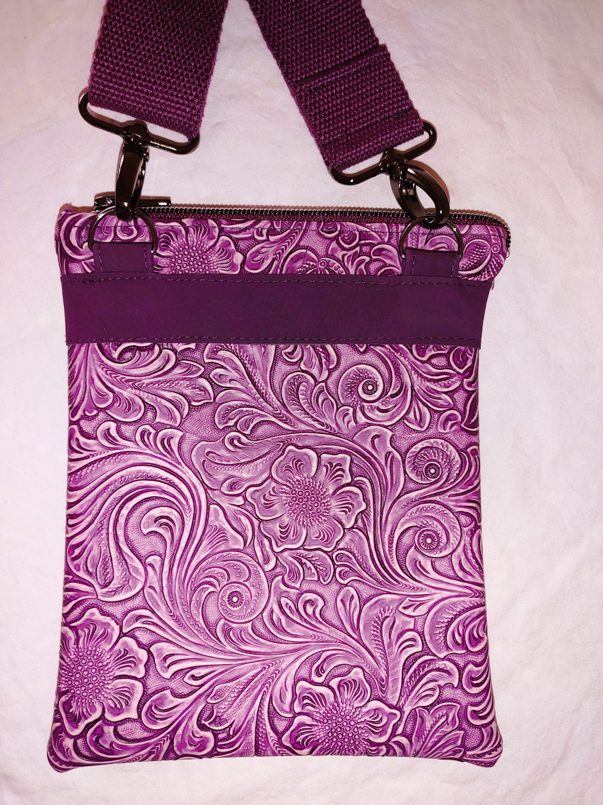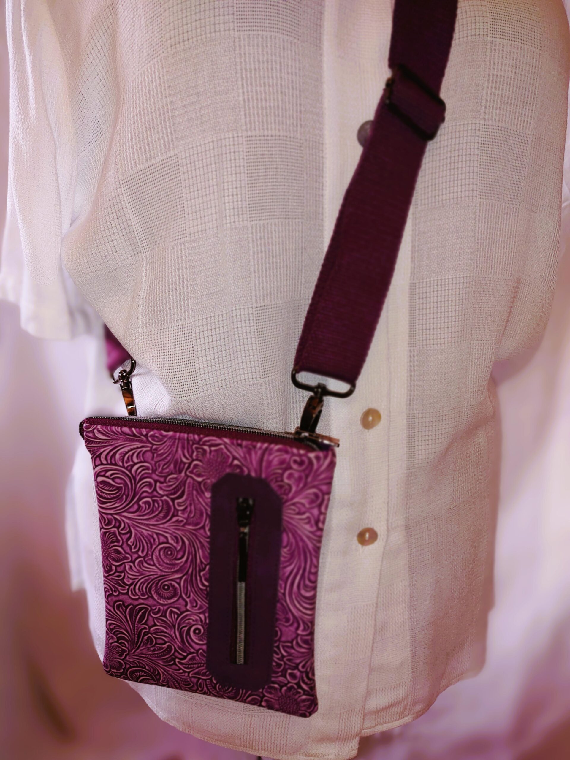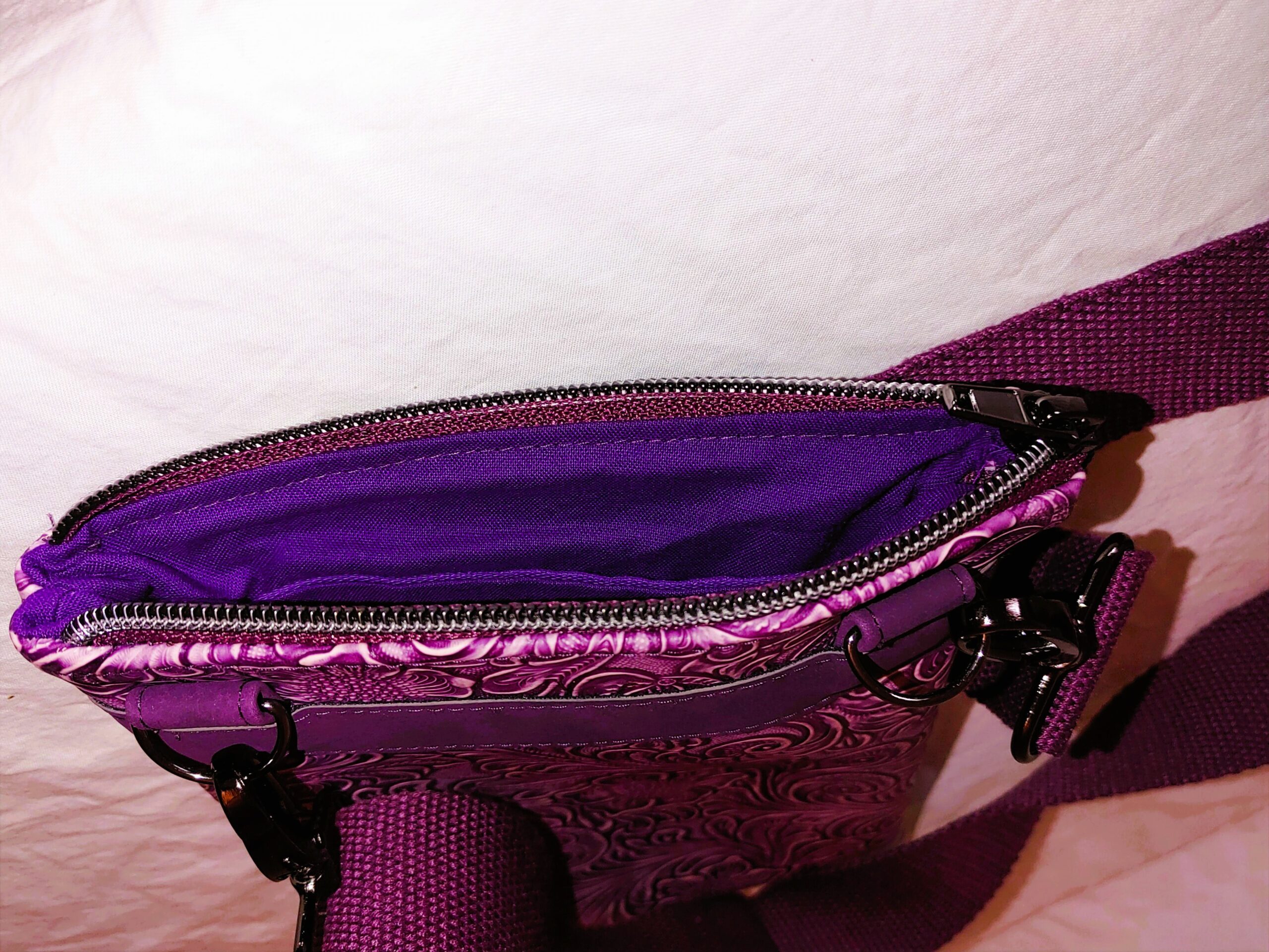 Fein geprägtes Lila trifft auf liebevolle Handarbeit: Kleine handgenähte Umhängetasche aus Kunstleder mit Reißverschluss und verstellbarem Gurt – dein stilvoller Begleiter für Alltag, Reisen oder besondere Anlässe.