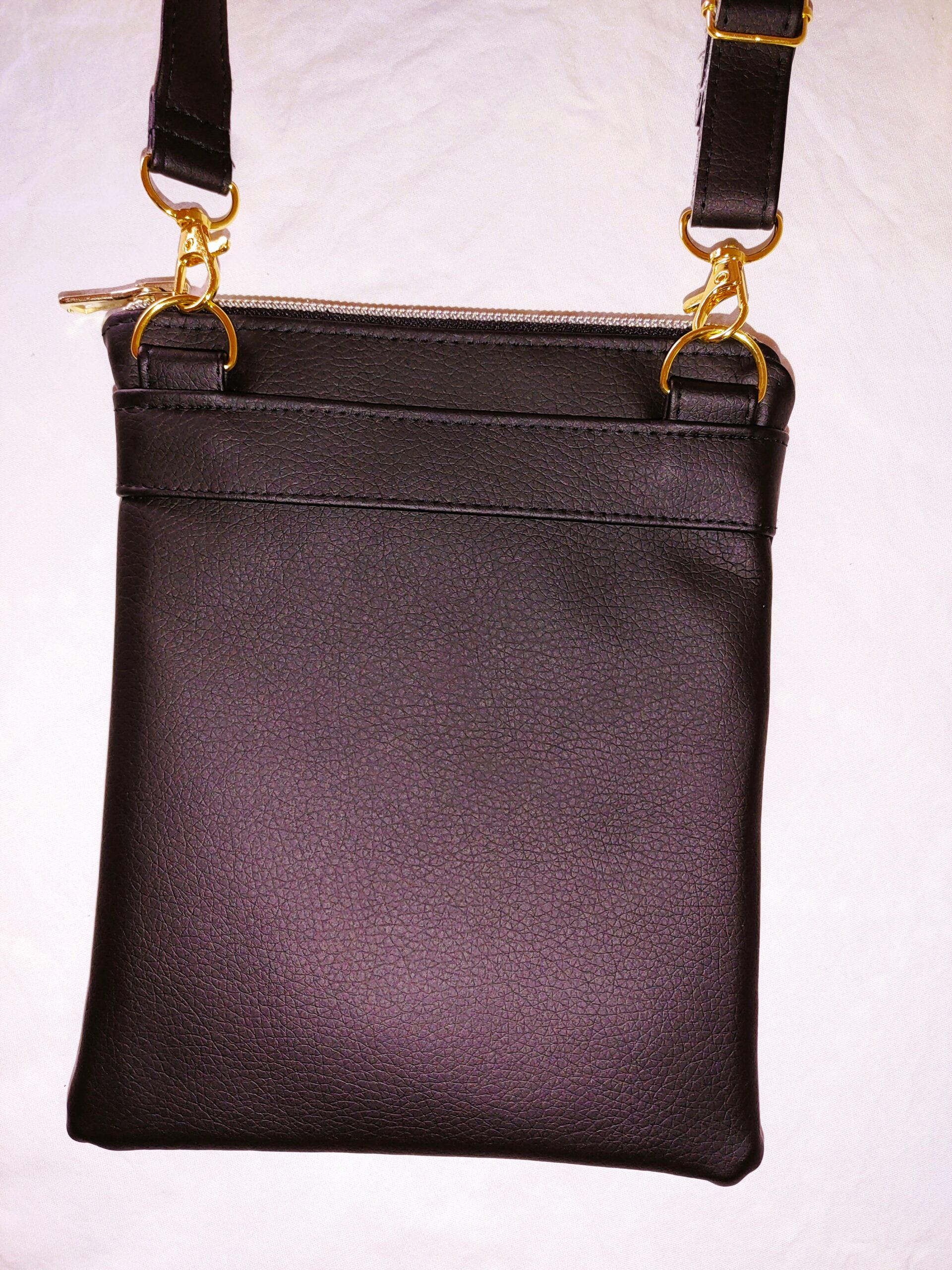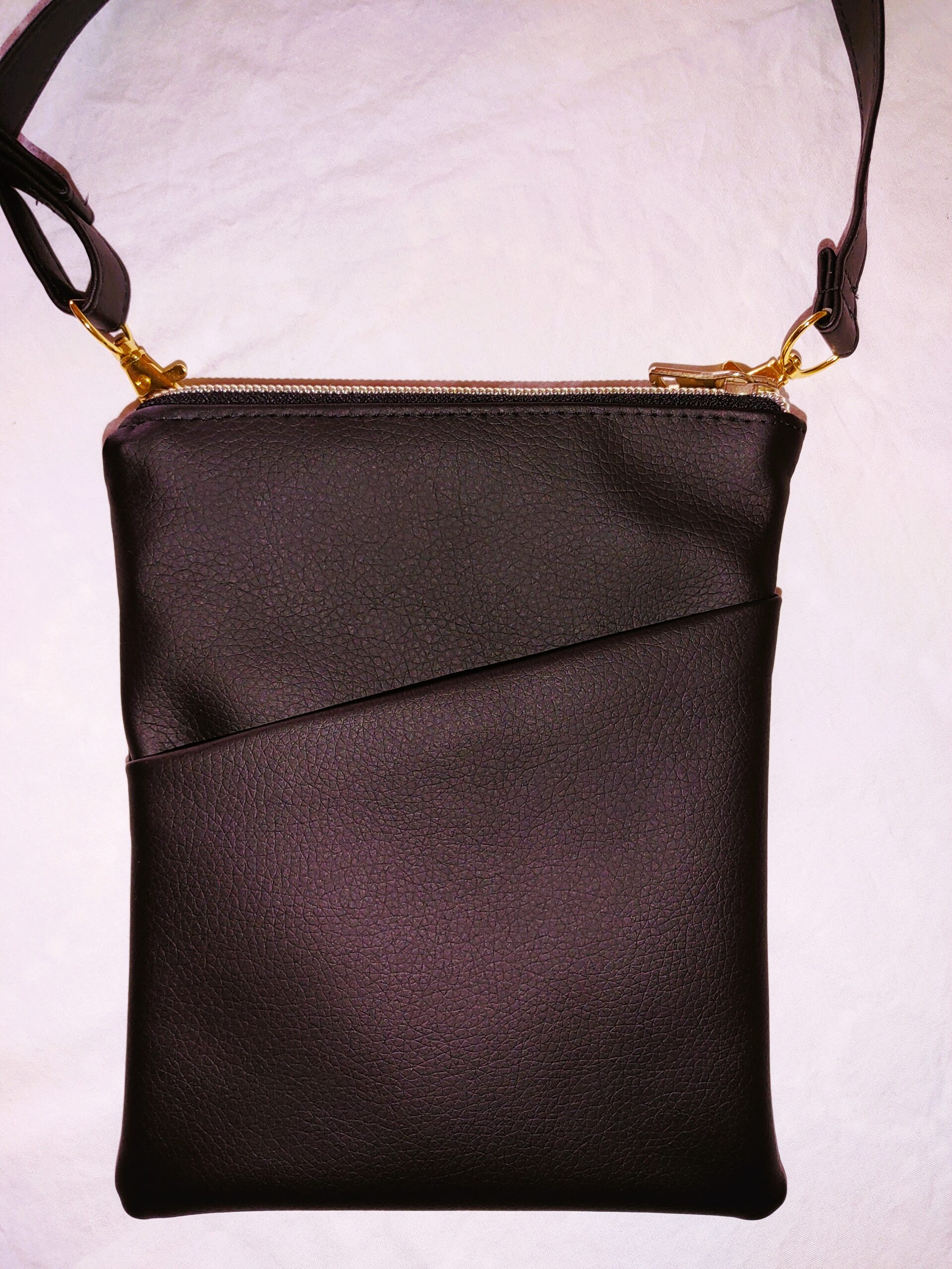 Elegantes Schwarz trifft auf goldene Details: Kleine handgenähte Umhängetasche aus glattem Kunstleder mit Steckfach außen, Reißverschluss- und Steckfach innen sowie verstellbarem Gurt – stilvoll, praktisch & vegan.