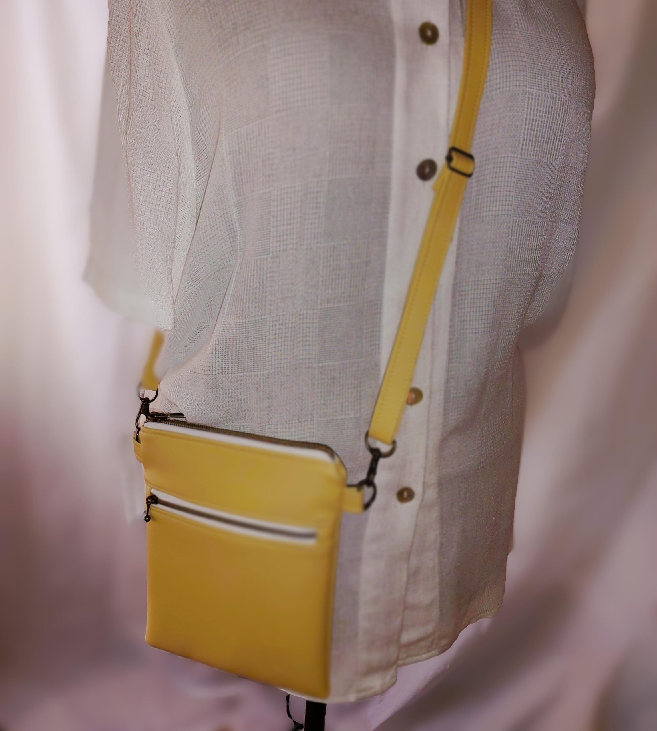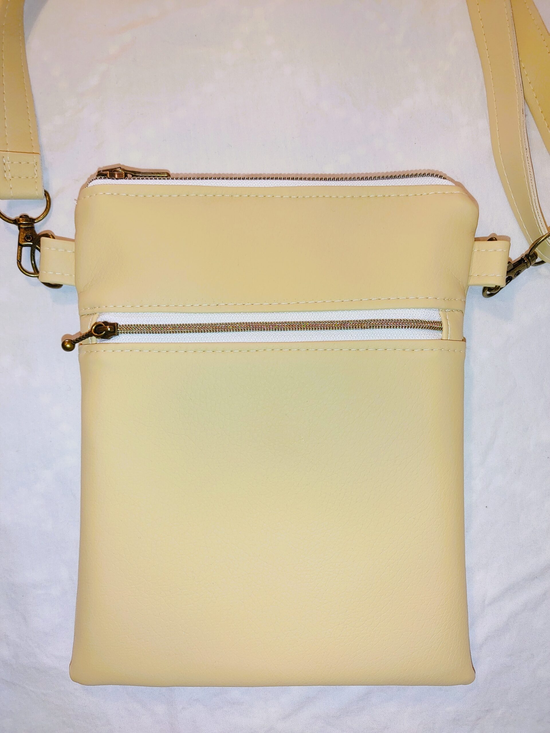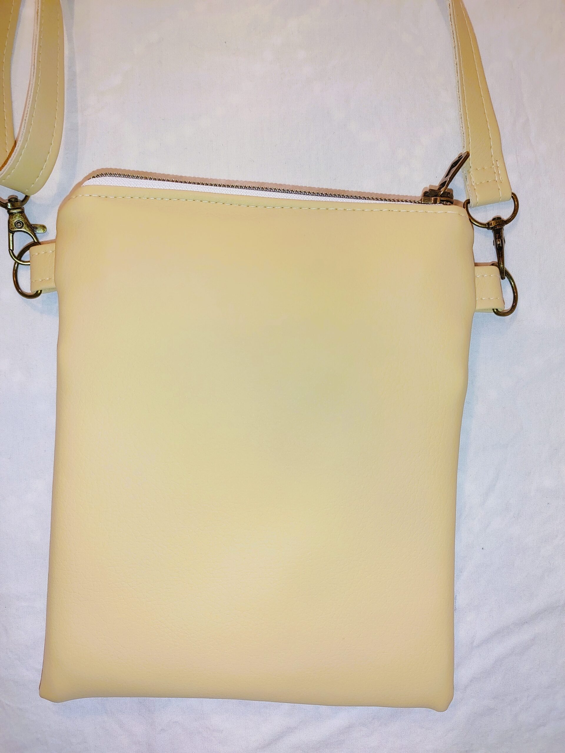 Zartes Buttergelb trifft auf liebevolle Handarbeit: Kleine handgenähte Umhängetasche aus Kunstleder mit Reißverschluss und verstellbarem Gurt – dein perfekter Begleiter für Alltag, Reisen oder zum Ausgehen.