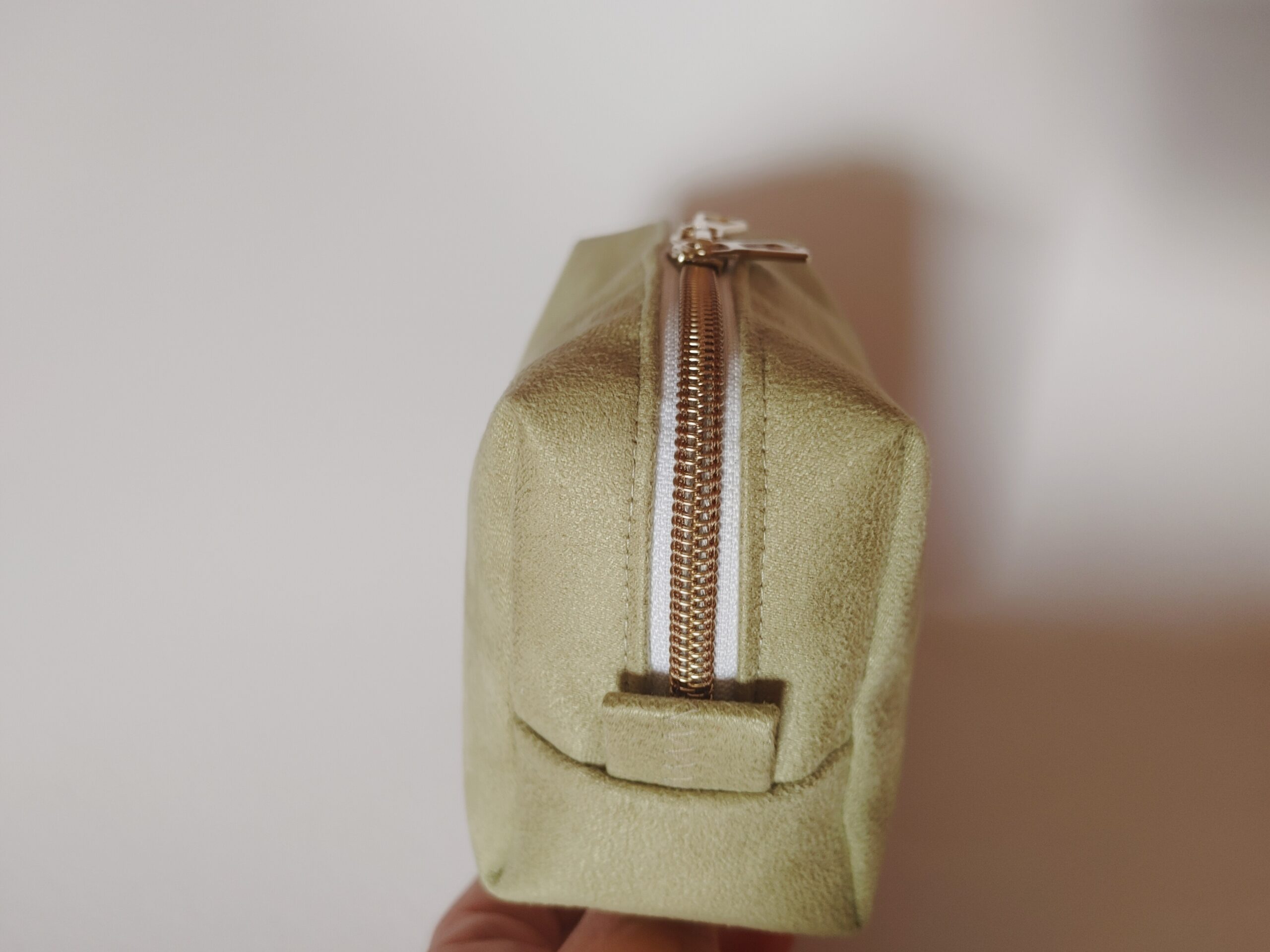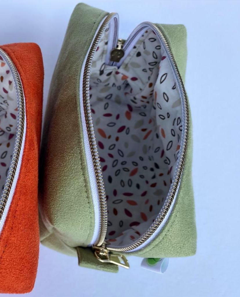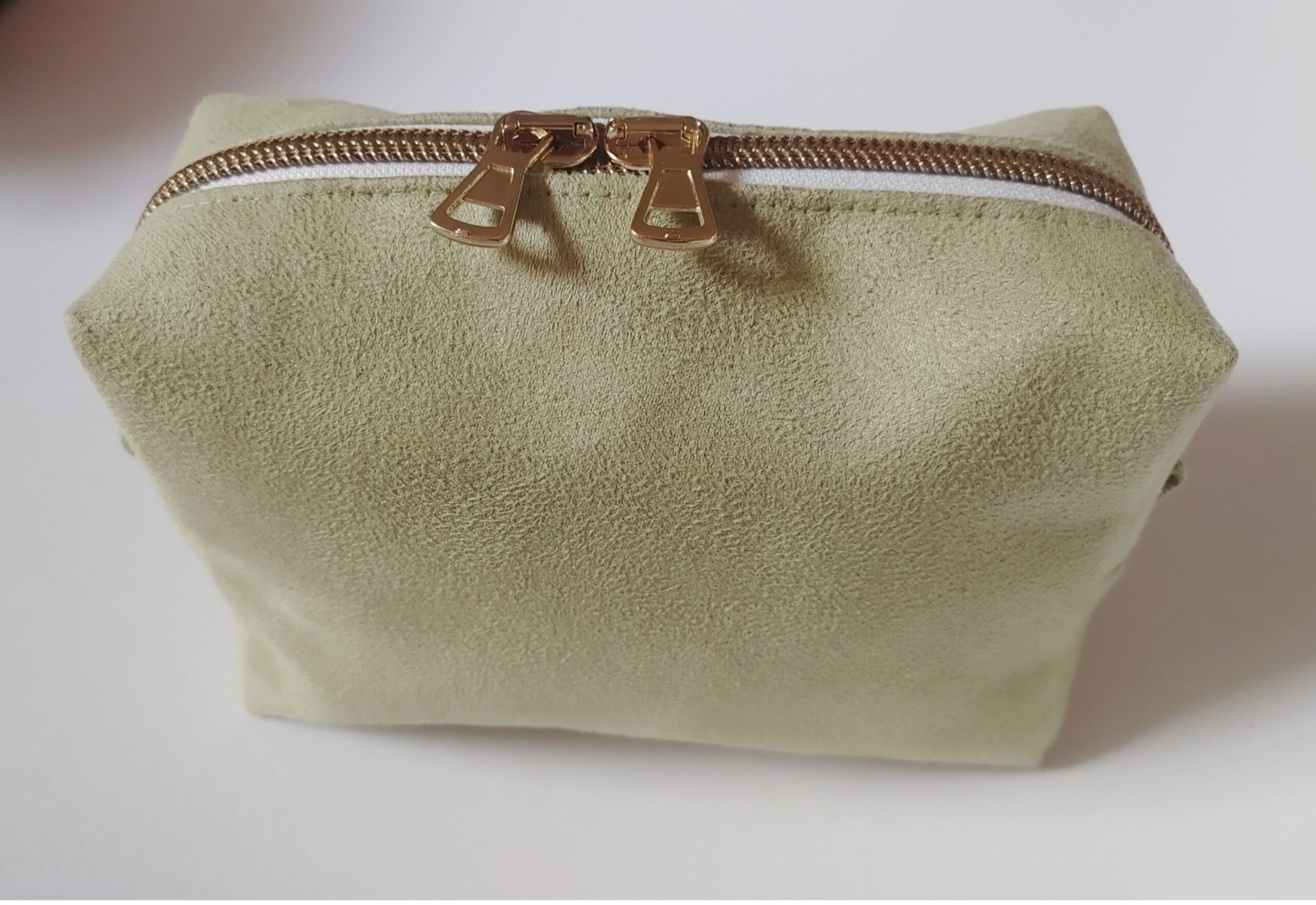 Zarte Kosmetiktasche aus angerautem lindgrünem Kunstleder in edler Wildlederoptik. Handgenähtes Einzelstück mit goldenem Reißverschluss und dezent gemustertem Innenfutter – formstabil, weich und stilvoll.