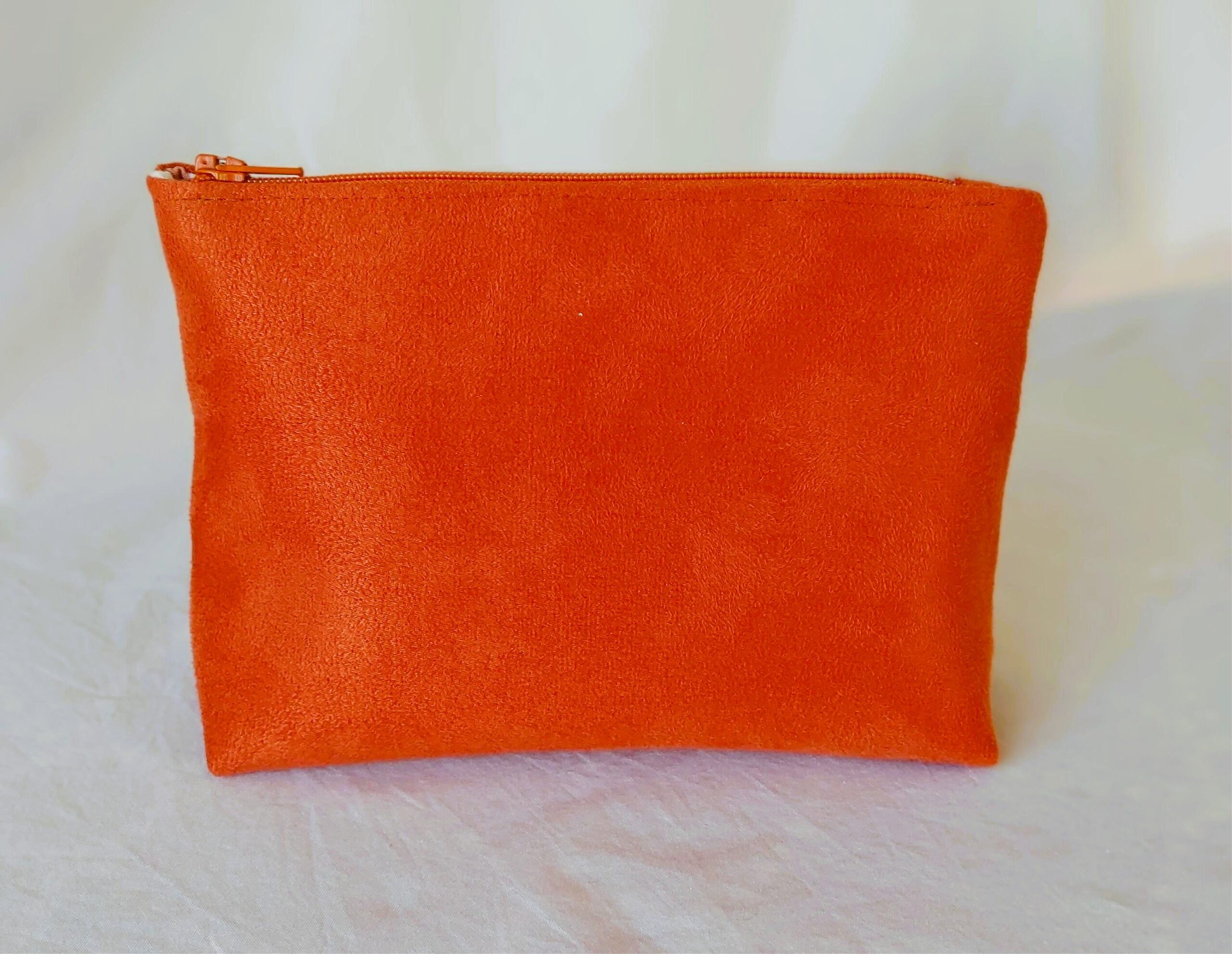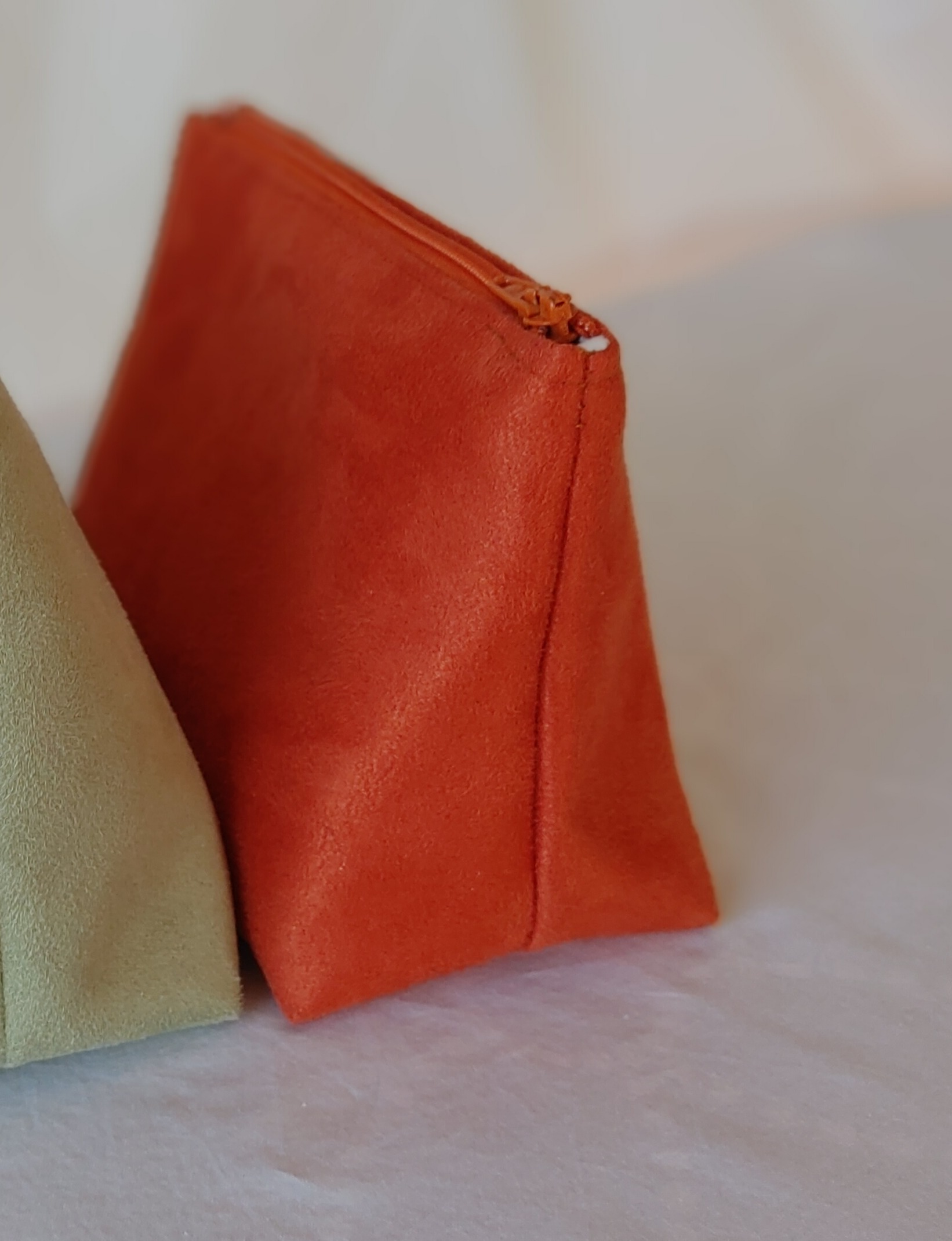 Diese handgenähte Kosmetiktasche verbindet schlichte Eleganz mit einer warmen, natürlichen Farbnote. Das angeraute Kunstleder in Terrakotta erinnert in Haptik und Optik an feines Wildleder – weich, matt und angenehm griffig.