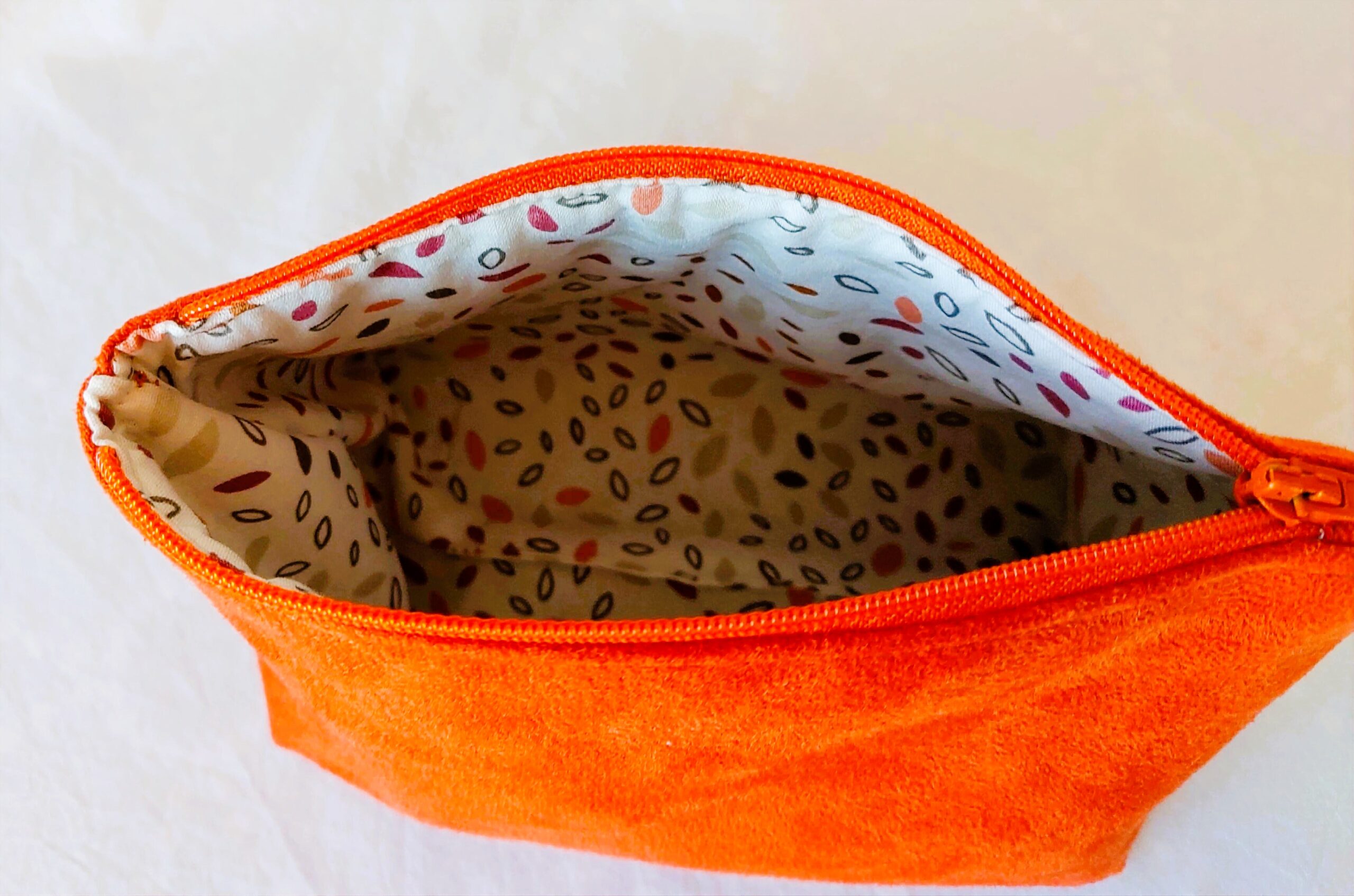 Kosmetiktasche aus terrakottafarbenem Kunstleder mit breitem Boden – handgenähtes Unikat mit farblich passendem Reißverschluss und dezent gemustertem Innenfutter.